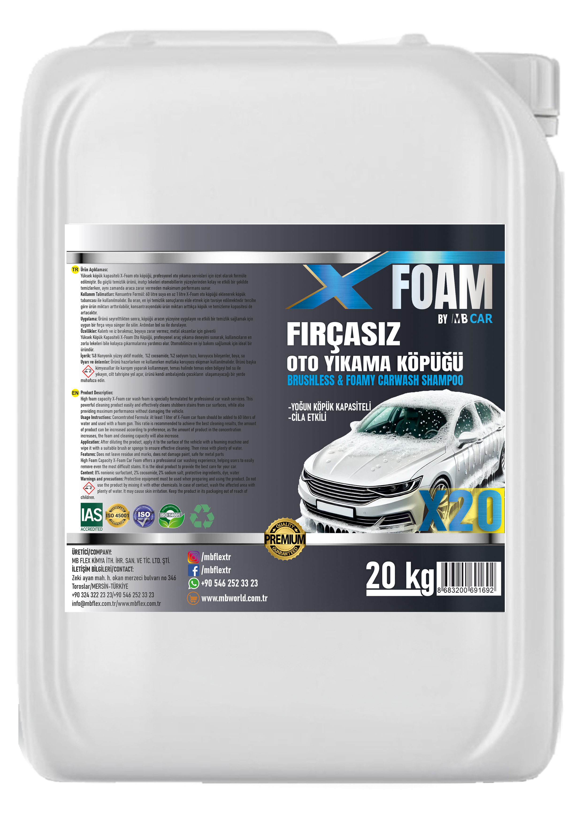 X20 Profesyonel Oto Köpüğü, oto yıkama servislerinin yoğun kullanım ihtiyaçları için geliştirilmiş güçlü bir araç yıkama köpüğüdür. Yüksek köpük kapasitesi sayesinde araç yüzeyinde kalıcı ve yoğun bir köpük tabakası oluşturarak kirlerin kolayca çözülmesini sağlar.